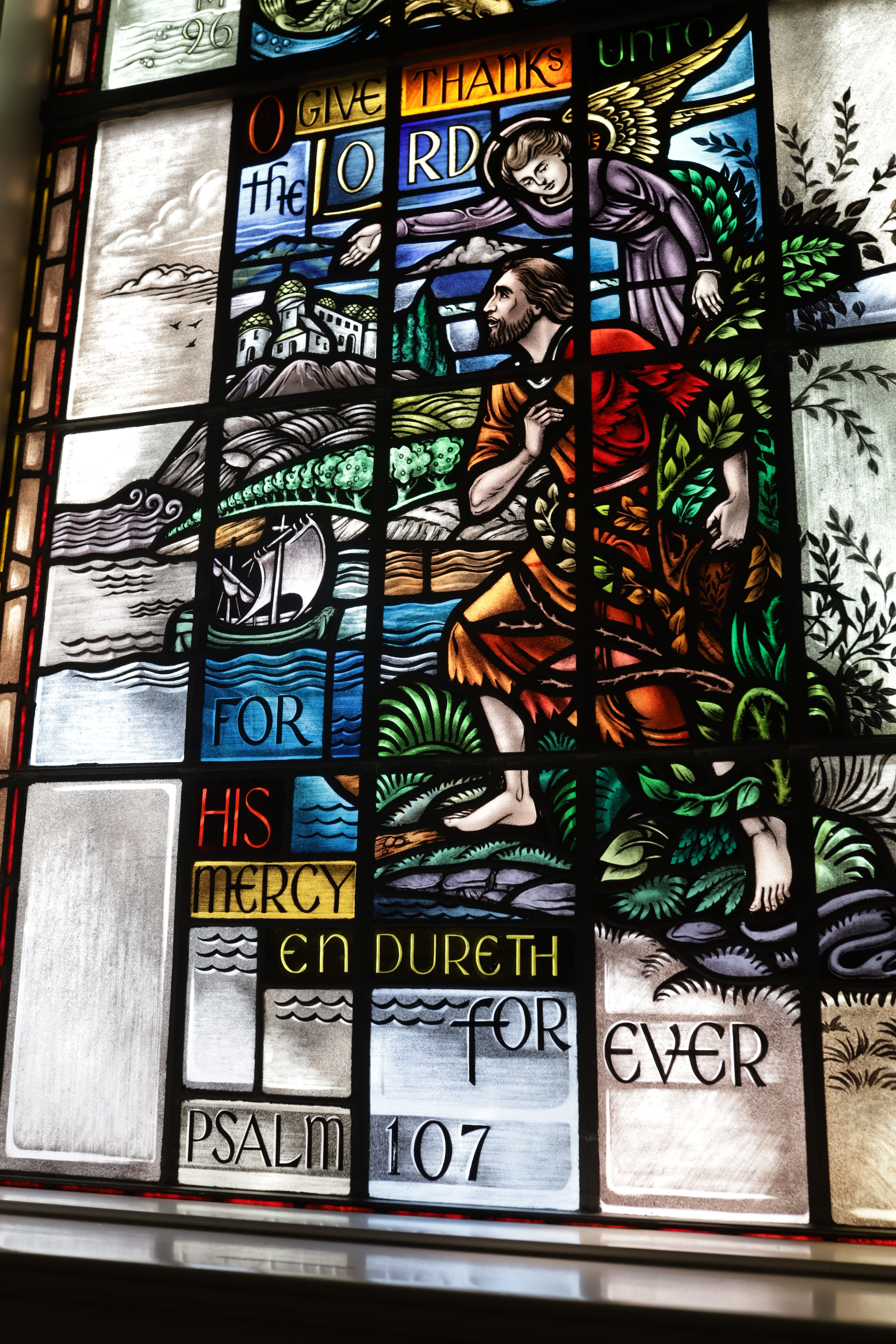 Safe passage is depicted in one of the stained glass windows in our Chapel. In the image, the traveler is headed to the beautiful city, but his leg is covered with creeping vines. This is a picture of our fallen state. But, the image on the window is nonetheless hopeful as the man continues walking, peering at the new home he desires.